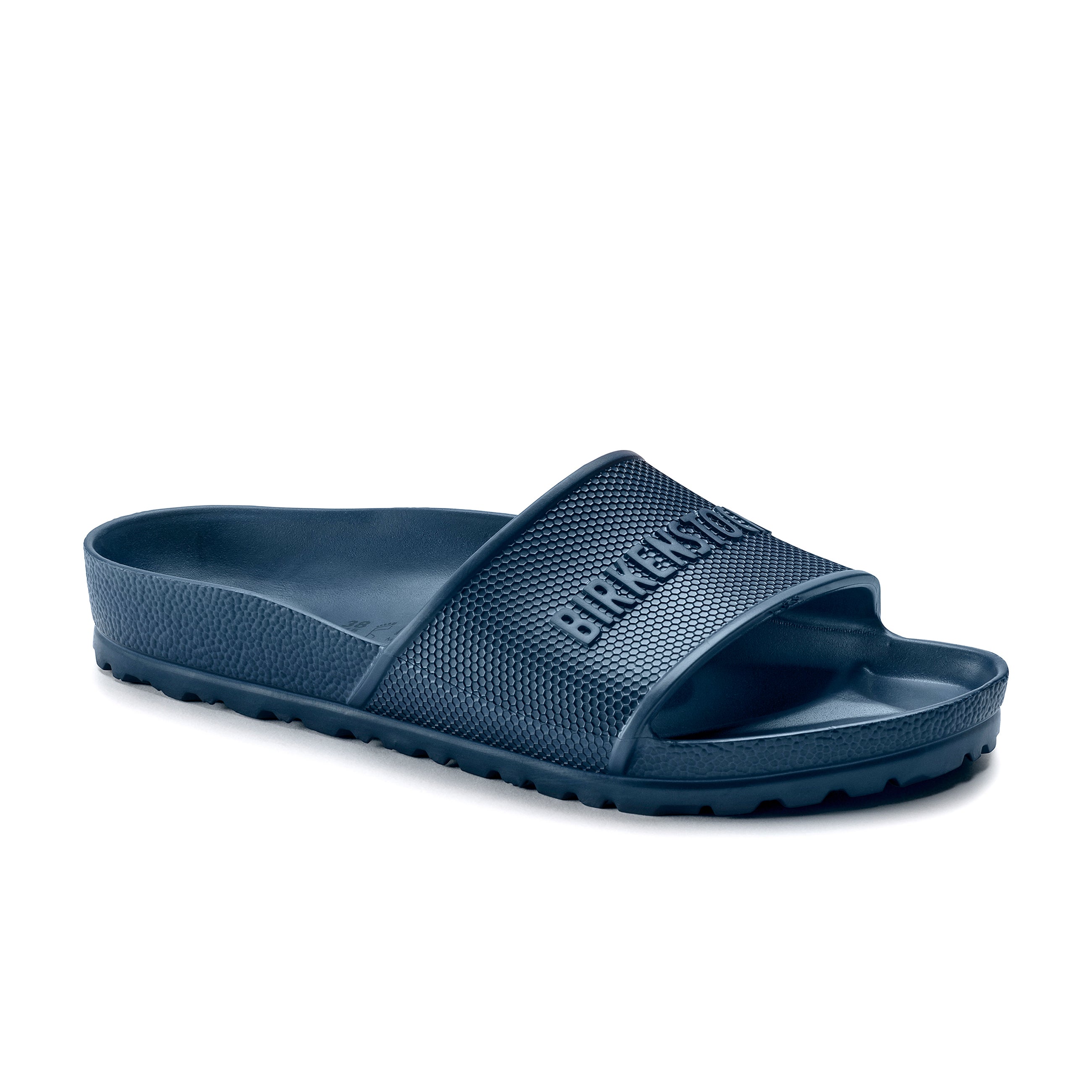 The Birkenstock Barbados is a waterproof lightweight. sporty slide design with a hexagon pattern and logo lettering. Modelled on the cork sandal. this sandal is made from one piece of light. flexible and waterproof moulded EVA.