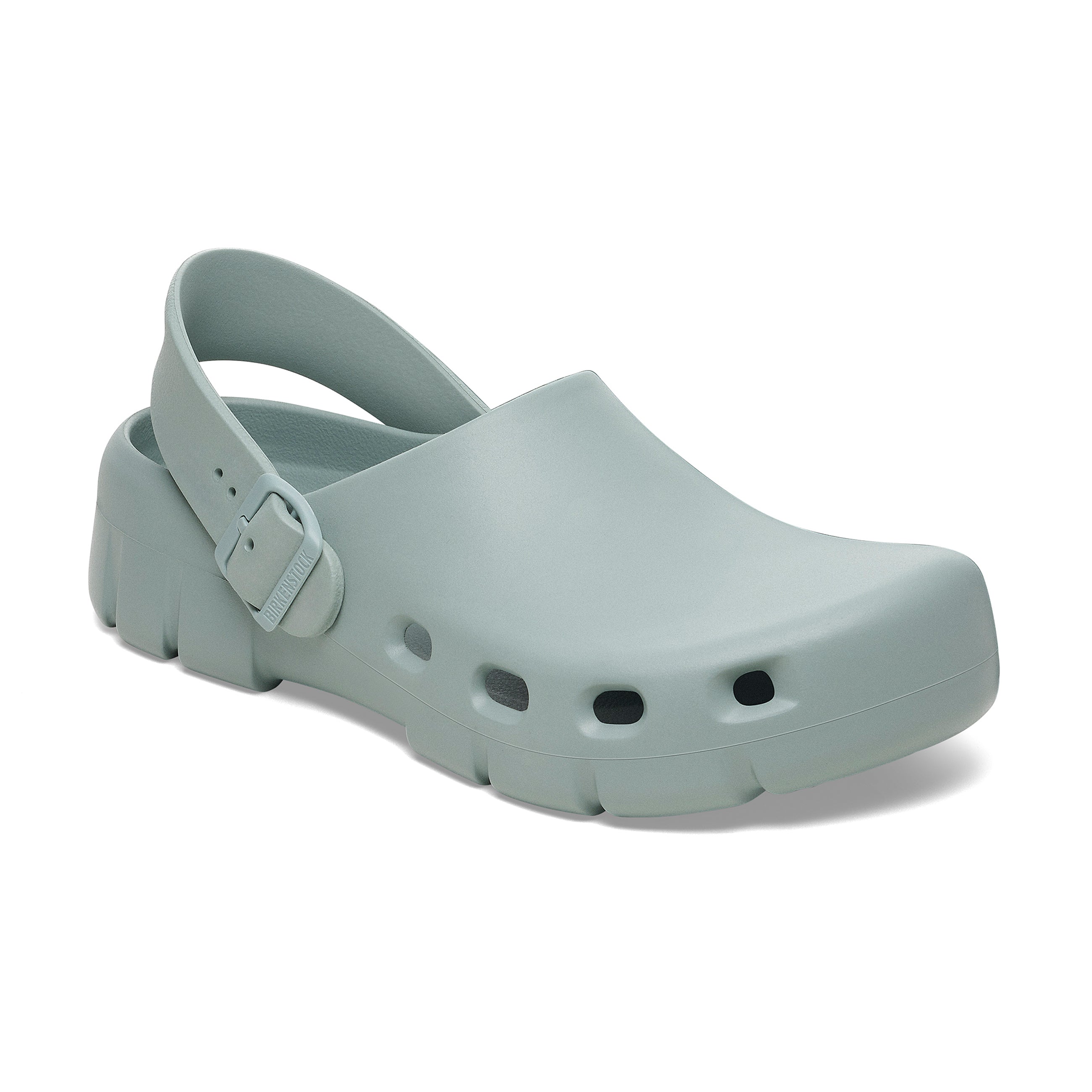 Introducing the all-new Birki Flow. our first post-sport recovery clog. Designed around the contours of our iconic footbed and bestselling Birki clogs. this new lightweight EVA (ethylene vinyl acetate) model is ultra-breathable. highly flexible. odour resistant and water-friendly. This EVA clog provides the support that Birkenstock wearers know and love along with the added comfort of air circulation from strategically placed vents that aid breathability. It is completed with classic Birkenstock design cues. from the adjustable backstrap to the moulded buckle.
