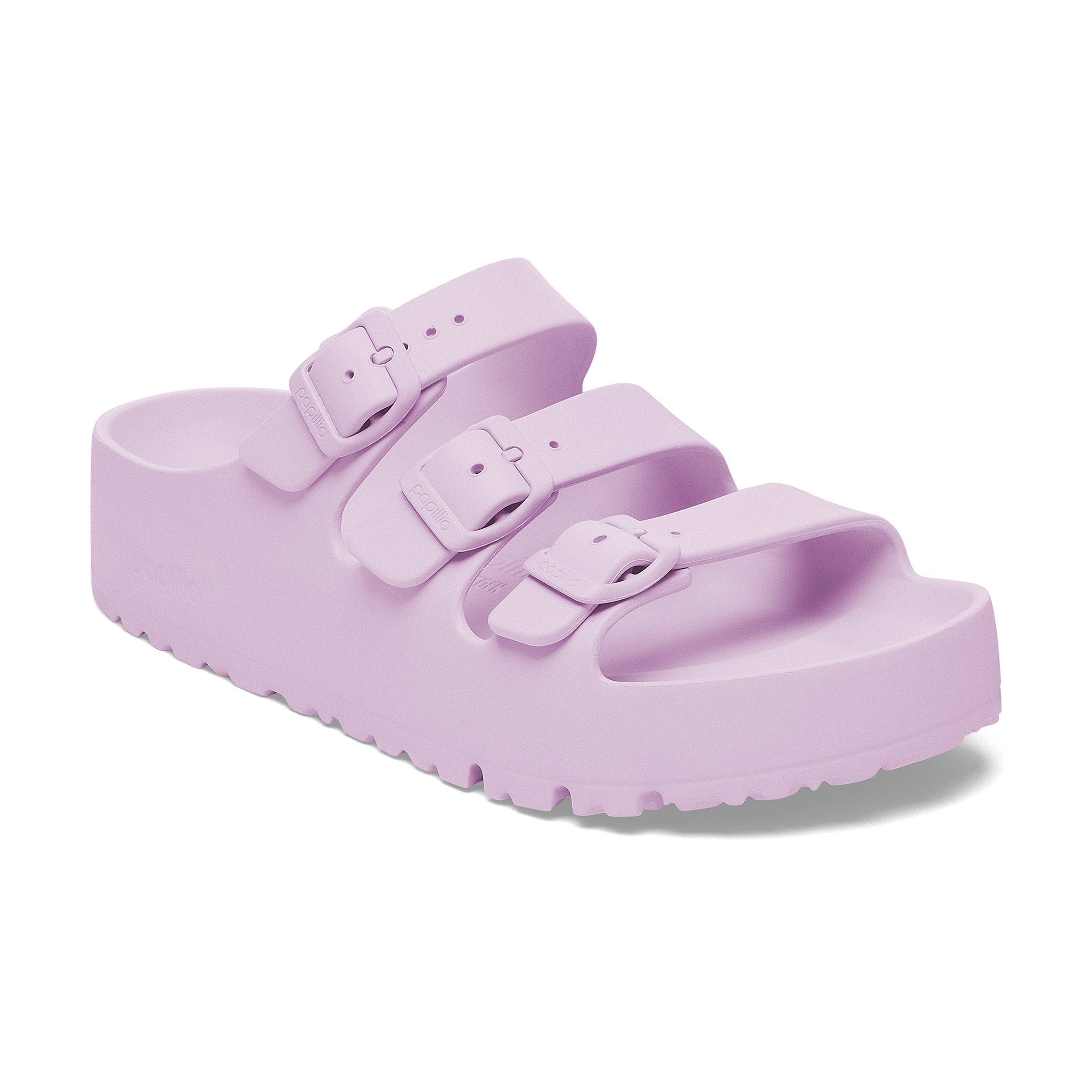The Birkenstock Florida is the ideal sandal for anyone who spends a lot of time on their feet. This three-strap sandal offers good grip and maximum comfort. The new platform flex outsole has a wider heel section for increased stability and ideal weight distribution. The updated design with horizontal grooves in the front part improves flexibility and the rolling motion. Modeled on the cork original. this sandal is made from especially light and highly flexible EVA. This high-quality. odor-neutral synthetic material which has been tested for harmful substances is shock-absorbent. water-resistant. and skin-friendly. It is therefore perfect for wearing on the beach. in the garden. or in wellness and spa areas.